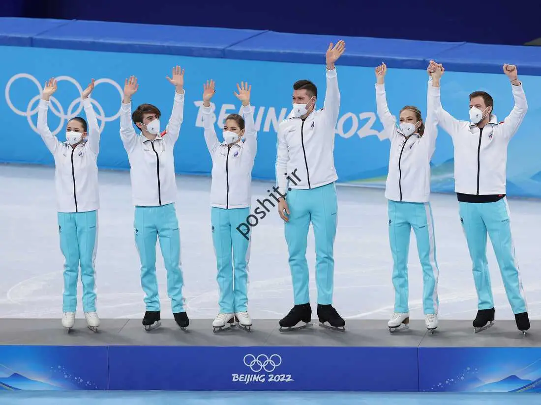 کامیلا ولیوا (L) و سایر اعضای تیم ROC عملکرد مدال طلای خود را در مراسم گل رویداد تیمی در 7 فوریه 2022 در بازیهای المپیک زمستانی پکن جشن میگیرند.